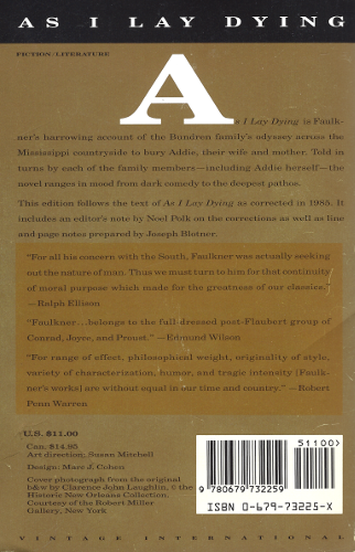 A true 20th-century classic from the Nobel Prize-winning author of The Sound and the Fury: the famed harrowing account of the Bundren family’s odyssey across the Mississippi countryside to bury Addie, their wife and mother. As I Lay Dying is one of the most influential novels in American fiction in structure, style, and drama. Narrated in turn by each of the family members, including Addie herself as well as others, the novel ranges in mood from dark comedy to the deepest pathos. “I set out deliberately to write a tour-de-force. Before I ever put pen to paper and set down the first word I knew what the last word would be and almost where the last period would fall.” —William Faulkner on As I Lay Dying This edition reproduces the corrected text of As I Lay Dying as established in 1985 by Noel Polk.