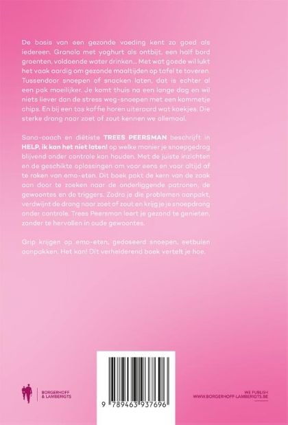 De basis van een gezonde voeding kent iedereen. Granola met yoghurt als ontbijt, een half bord groenten, voldoende water drinken... Met wat goede wil lukt vaak het aardig om gezonde maaltijden op tafel te toveren. Maar snoepen tussendoor laten, dat is al een pak moeilijker. Dat kommetje chips 's avonds in de zetel is zo aanlokkelijk. Thuiskomen na een lange dag en de stress weg-snoepen. Bij een tas koffie horen koekjes. Een lichaam dat schreeuwt om chocolade. Die sterke drang kent praktisch iedereen. Sana-coach en diëtiste Trees Peersman beschrijft in Help, ik kan het niet laten! op welke manier men snoepgedrag blijvend onder controle kan krijgen. Met de juiste inzichten en de geschikte oplossingen om dat snoepduiveltje voor eens en voor altijd te slim af te zijn. Dit boek pakt de kern van de zaak aan door te zoeken naar de onderliggende patronen, de gewoontes en de triggers. Zodra di kern goed zit, verdwijnt dat smekende stemmetje. Zo lukt het om die snoepdrang onder controle te krijgen en gewoon gezond te genieten, zonder te hervallen in oude gewoontes. Grip krijgen op emo-eten, gedoseerd snoepen, eetbuien aanpakken. Het kan! Dit verhelderend boek vertelt je hoe.
