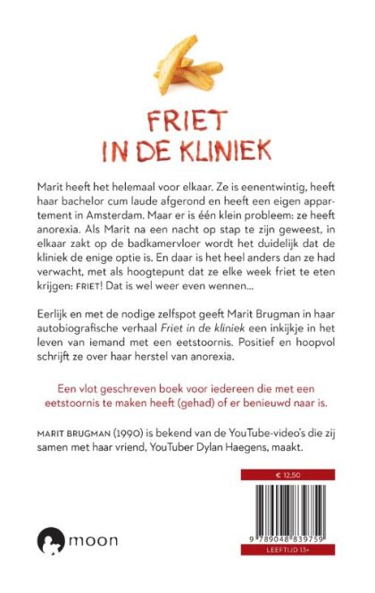 ‘Friet in de kliniek’ is het autobiografisch verhaal van Marit Brugman die op het eind van haar tienerjaren de eetstoornis ‘anorexia’ ontwikkelt. Voorheen was zij een vrolijke meid die nooit overgewicht had en van het leven genoot. Maar op een gegeven moment veranderde dit en stilletjes aan werd eten een obsessie en grote angst voor haar.