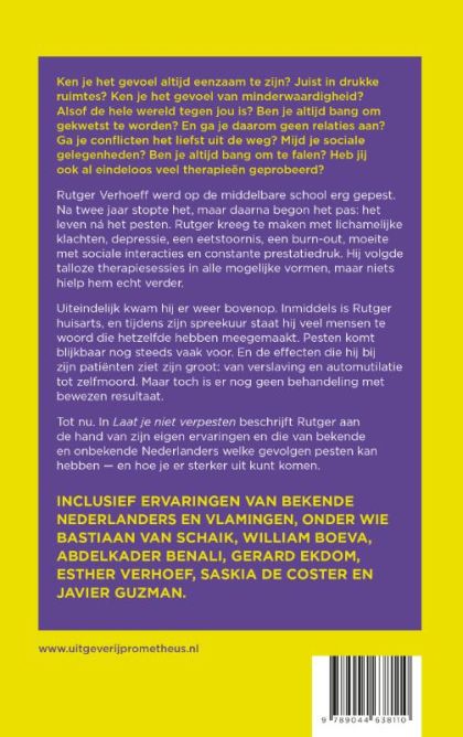 Pesten is helaas van alle tijden en het is meestal heel ingrijpend in het leven van de gepeste persoon. De auteur van dit boek, Rutger Verhoeff, had er helaas ook mee te maken op de middelbare school. En ook al duurde het pesten ‘maar’ twee jaar, toch had dit grote gevolgen zoals lichamelijke klachten, een depressie, een eetstoornis, een burn-out, problemen met sociale contacten, een drang naar perfectionisme en prestatiedruk.