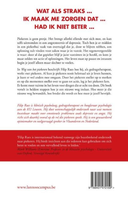 Met Weg van het piekeren schreef Filip Raes een duidelijk verstaanbaar en prettig leesbaar boek voor de notoire piekeraars onder ons. Het is duidelijk hoe hij gebruik maakt van zijn kennis over hoe mensen leren, om de boodschap aan zijn lezers op een vatbare manier over te brengen. Zo gebruikt hij het acroniem PiTA om ons eraan te herinneren: merk je dat je aan het Piekeren bent? Dan is het Tijd voor Actie.