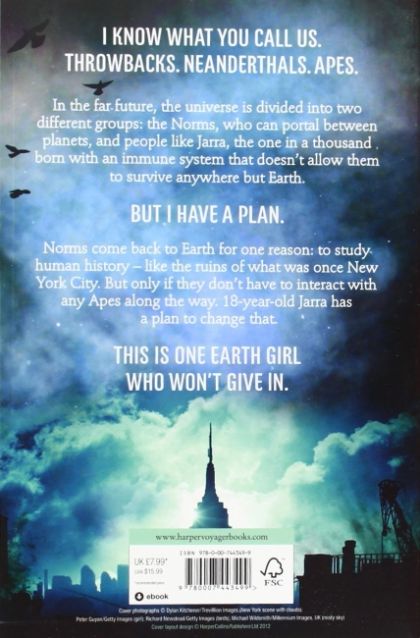 2788. Only the handicapped live on Earth. Eighteen-year-old Jarra is among the one in a thousand people born with an immune system that cannot survive on other planets. Sent to Earth at birth to save her life, she has been abandoned by her parents. She can't travel to other worlds, but she can watch their vids, and she knows all the jokes they make. She's an "ape," a "throwback," but this is one ape girl who won't give in.