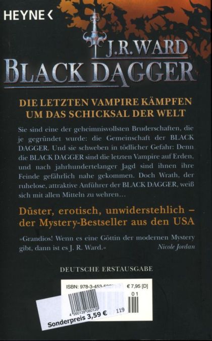 Düster, erotisch, unwiderstehlich - die letzten Vampire kämpfen um das Schicksal der WeltDas Leben der jungen Beth Randall verläuft eigentlich in ruhigen Bahnen - sie lebt in einem zu kleinen Apartment, geht selten aus und hat einen schlecht bezahlten Reporterjob bei einer kleinen Zeitung in Caldwell, New York. Ihr Job ist es auch, der sie an den Tatort eines ungewöhnlichen Mordes führt: Vor einem Club ist ein Mann bei der Explosion einer Autobombe gestorben, und die Polizei kann keinen Hinweis auf die wahre Identität des Toten finden. Dann trifft Beth auf den geheimnisvollen Wrath, der in Zusammenhang mit dem Mord zu stehen scheint. Der attraktive Fremde übt eine unheimliche Anziehung auf sie aus, der sie sich nicht entziehen kann. Während sie sich auf eine leidenschaftliche Affäre mit Wrath einlässt, wächst in ihr der Verdacht, dass er der gesuchte Mörder ist. Und Wrath hat noch ein paar Überraschungen mehr für sie auf Lager, denn er behauptet, ein Vampir zu sein - und das Oberhaupt der Bruderschaft der BLACK DAGGER, die seit Jahrhunderten einen gnadenlosen Krieg um das Schicksal der Welt führen muss ...