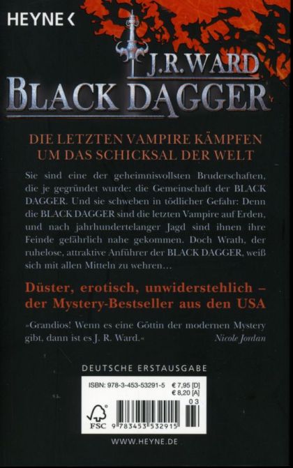 Sie sind eine der geheimnisvollsten Bruderschaften, die je gegründet wurden: die Gemeinschaft der BLACK DAGGER. Und sie schweben in tödlicher Gefahr. Denn die BLACK DAGGER sind die letzten Vampire auf Erden, und nach jahrhundertelanger Jagd sind ihnen ihre Feinde gefährlich nahe gekommen. Doch Wrath, der ruhelose, attraktive Anführer der BLACK DAGGER, weiß sich mit allen Mitteln zu wehren.