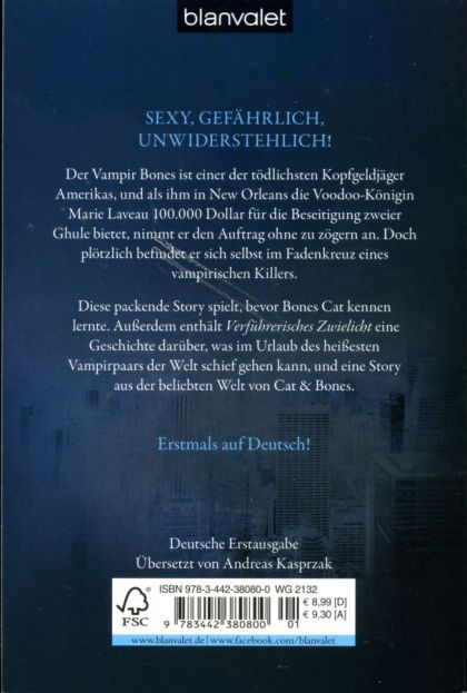 SEXY, GEFÄHRLICH, UNWIDERSTEHLICH! Der Vampir Bones ist einer der tödlichsten Kopfgeldjäger Amerikas, und als ihm in New Orleans die Voodoo-Königin Marie Laveau 100.000 Dollar für die Beseitigung zweier Ghule bietet, nimmit er den Auftrag ohne zu zögern an. Doch plötzlich befindet er sich selbst im Fadenkreuz eines vampirischen Killers. Diese packende Story spielt, bevor Bones Cat kennen lernte. Außerdem enthält Verführerisches Zwielicht eine Geschichte darüber, was im Urlaub des heißesten Vampirpaars der Welt schief gehen kann, und eine Story aus der beliebten Welt von Cat & Bones.