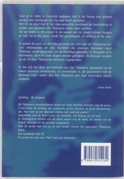 Tibetaans conversatieboek met dialogen bedoeld om Tibetaans te leren spreken. De Nederlandse vertalingen helpen allicht ook in omgekeerde richting.