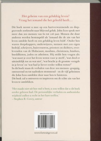 In dit boek staan de verhalen van deze 200 mensen -grappig, ontroerend en tot nadenken stemmend- en de vijf geheimen die John Izzo ontdekte door naar hen te luisteren.