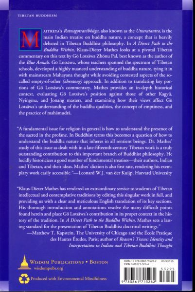 Maitreya's Ratnagotravibhaga, also known as the Uttaratantra, is the main Indian treatise on buddha nature, a concept that is heavily debated in Tibetan Buddhist philosophy. In A Direct Path to the Buddha Within, Klaus-Dieter Mathes looks at a pivotal Tibetan commentary on this text by Go Lotsawa Zhonu Pal, best known as the author of the Blue Annals. Go Lotsawa, whose teachers spanned the spectrum of Tibetan schools, developed a highly nuanced understanding of buddha nature, tying it in with mainstream Mahayana thought while avoiding contested aspects of the so-called empty-of-other (zhentong) approach. In addition to translating key portions of Go Lotsawa's commentary, Mathes provides an in-depth historical context, evaluating Go's position against those of other Kagyu, Nyingma, and Jonang masters and examining how Go Lotsawa's view affects his understanding of the buddha qualities, the concept of emptiness, and the practice of mahamudra.