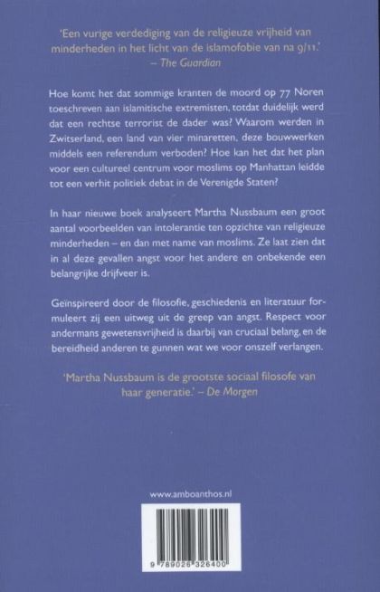 Hoe komt het dat sommige kranten de moord op 77 Noren toeschreven aan islamitische extremisten, totdat duidelijk werd dat een rechtse terrorist de dader was? Waarom werden in Zwitserland, een land van vier minaretten, middels een referendum deze bouwwerken verboden? Hoe kan het dat het plan voor een cultureel centrum voor moslims op Manhattan leidde tot een verhit politiek debat in de Verenigde Staten? In haar nieuwe boek analyseert Martha Nussbaum een groot aantal voorbeelden van intolerantie ten opzichte van religieuze minderheden en dan met name ten opzichte van moslims. Ze laat zien dat in al deze gevallen angst voor het andere en onbekende een belangrijke drijfveer is. Geïnspireerd door de filosofie, geschiedenis en literatuur formuleert zij een uitweg uit de greep van de angst. Respect voor andermans gewetensvrijheid is daarbij van cruciaal belang, en de bereidheid anderen te gunnen wat we voor onszelf verlangen.