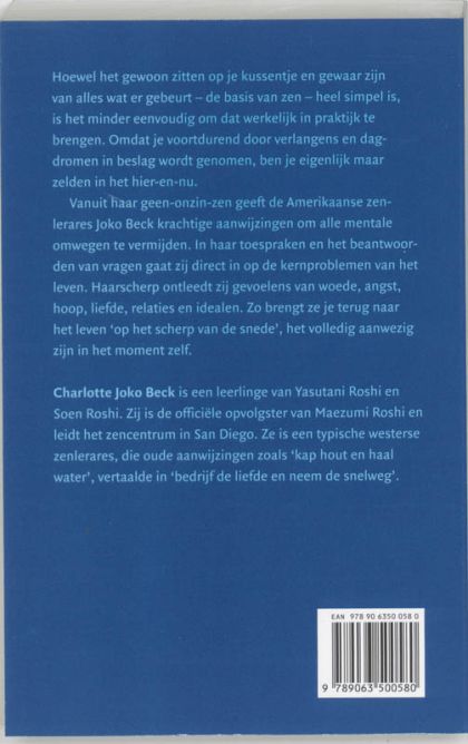 Hoewel het gewoon zitten op je kussentje en gewaar zijn van alles wat er gebeurt - de basis van zen - heel simpel is, is het minder eenvoudig om dat werkelijk in praktijk te brengen. Omdat je voortdurend door verlangens en dagdromen in beslag wordt genomen, ben je eigenlijk maar zelden in het hier-en-nu.Vanuit haar geen-onzin-zen geeft de Amerikaanse zen-lerares Joko Beck krachtige aanwijzingen om alle mentale omwegen te vermijden. In haar toespraken en het beantwoorden van vragen gaat zij direct in op de kernproblemen van het leven. Haarscherp ontleedt zij gevoelens van woede, angst, hoop, liefde, relaties en idealen. Zo brengt ze je terug naar het leven 'op het scherp van de snede', het volledig aanwezig zijn in het moment zelf.