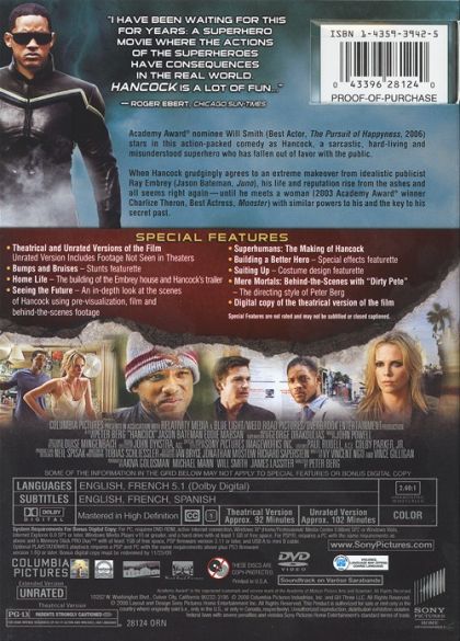 Hancock is a down-and-out superhero who's forced to employ a PR expert to help repair his image when the public grows weary of all the damage he's inflicted during his lifesaving heroics. The agent's idea of imprisoning the antihero to make the world miss him proves successful, but will Hancock stick to his new sense of purpose or slip back into old habits?