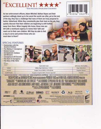As law enforcement officers, Adam Mitchell, Nathan Hayes, and their partners are confident and focused. They willingly stand up to the worst the streets have to offer. Yet at the end of the day, they face a challenge that none of them are truly prepared to tackle: fatherhood. They know that God desires to turn the hearts of fathers to their children, but their children are beginning to drift further and further away from them. When tragedy hits home, these men are left wrestling with their hopes, their fears, their faith, and their fathering. Can a new found urgency help these dads draw closer to God ... and to their children? COURAGEOUS is the fourth release of Sherwood Pictures, the movie making ministry of Sherwood Church in Albany, Georgia. Their first release since FIREPROOF, the No. 1 independent film of 2008, COURAGEOUS joins FACING THE GIANTS and FLYWHEEL in touching and impacting lives through heartfelt stories of faith and hope.