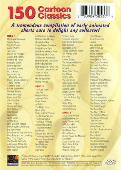 All your favorite characters are there including Woody Woodpecker, Casper the Ghost, Betty Boop, Little Lulu, Baby Huey, The Three Stooges and many more. You"ll discover rare gems from the early days of animation that are sure to delight any collector. It's all here in this 150 cartoon treasury, digitally re-mastered on 4 DVDs.