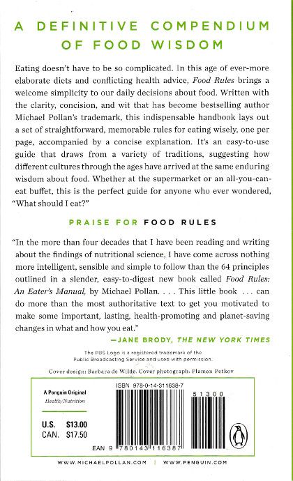 #1 New York Times Bestseller"A useful and funny purse-sized manual that could easily replace all the diet books on your bookshelf." —Tara Parker-Pope, The New York Times A definitive compendium of food wisdom Eating doesn’t have to be so complicated. In this age of ever-more elaborate diets and conflicting health advice, Food Rules brings welcome simplicity to our daily decisions about food. Written with clarity, concision, and wit that has become bestselling author Michael Pollan’s trademark, this indispensable handbook lays out a set of straightforward, memorable rules for eating wisely, one per page, accompanied by a concise explanation. It’s an easy-to-use guide that draws from a variety of traditions, suggesting how different cultures through the ages have arrived at the same enduring wisdom about food. Whether at the supermarket or an all-you-can-eat buffet, this is the perfect guide for anyone who ever wondered, “What should I eat?” "In the more than four decades that I have been reading and writing about the findings of nutritional science, I have come across nothing more intelligent, sensible and simple to follow than the 64 principles outlined in a slender, easy-to-digest new book called Food Rules: An Eater’s Manual, by Michael Pollan." —Jane Brody, The New York Times "It doesn't get much easier than this. Each page has a simple rule, sometimes with a short explanation, sometimes without, that promotes Pollan's back-to-the-basics-of-food (and-food-enjoyment) philosophy." —The Los Angeles Times