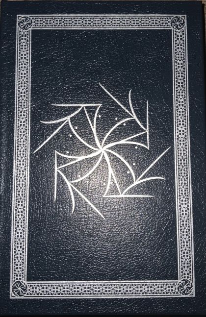 Premium Bonded Leather: Dark blue cover, with embossed Aonic designs on the front and spine.