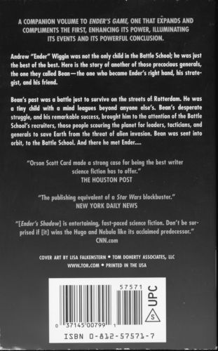 The novel that launched the bestselling Ender's Shadow series. The human race is at War with the "Buggers," an insect-like alien race. As Earth prepares to defend itself from total destruction at the hands of an inscrutable enemy, all focus is on the development of military geniuses who can fight such a war, and win. The long distances of interstellar space have given hope to the defenders of Earth--they have time to train these future commanders up from childhood, forging them into an irresistible force in the high orbital facility called the Battle School. Andrew "Ender" Wiggin was not the only child in the Battle School; he was just the best of the best. In Ender's Shadow, Card tells the story of another of those precocious generals, the one they called Bean--the one who became Ender's right hand, part of his team, in the final battle against the Buggers. Bean's past was a battle just to survive. His success brought him to the attention of the Battle School's recruiters, those people scouring the planet for leaders, tacticians, and generals to save Earth from the threat of alien invasion. Bean was sent into orbit, to the Battle School. And there he met Ender....THE ENDER UNIVERSEEnder seriesEnder’s Game / Ender in Exile / Speaker for the Dead / Xenocide / Children of the MindEnder’s Shadow seriesEnder’s Shadow / Shadow of the Hegemon / Shadow Puppets / Shadow of the Giant / Shadows in FlightChildren of the FleetThe First Formic War (with Aaron Johnston)Earth Unaware / Earth Afire / Earth AwakensThe Second Formic War (with Aaron Johnston)The Swarm /The HiveEnder novellasA War of Gifts /First Meetings
