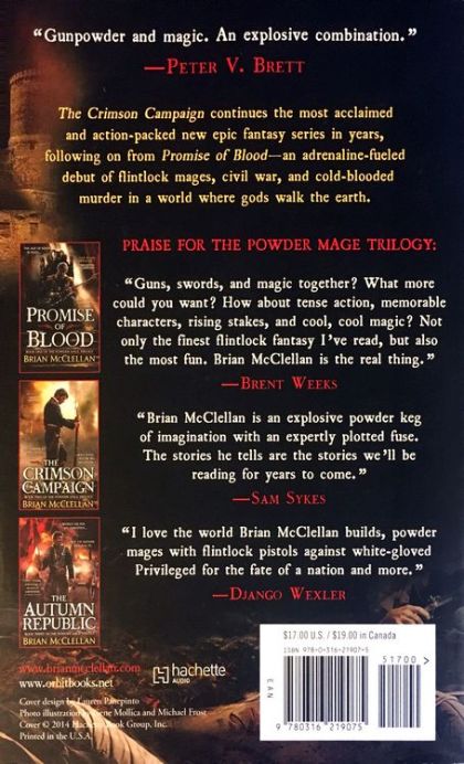 When invasion looms... Tamas's invasion of Kez ends in disaster when a Kez counter-offensive leaves him cut off behind enemy lines with only a fraction of his army, no supplies, and no hope of reinforcements. Drastically outnumbered and pursued by the enemy's best, he must lead his men on a reckless march through northern Kez to safety, and back over the mountains so that he can defend his country from an angry god, Kresimir. But the threats are closer to home... In Adro, Inspector Adamat only wants to rescue his wife. To do so he must track down and confront the evil Lord Vetas. He has questions for Vetas concerning his enigmatic master, but the answers will lead Adamat on a darker journey. Who will lead the charge? Tamas's generals bicker among themselves, the brigades lose ground every day beneath the Kez onslaught, and Kresimir wants the head of the man who shot him in the eye. With Tamas and his powder cabal presumed dead, Taniel Two-shot finds himself as the last line of defense against Kresimir's advancing army. In a rich, distinctive world that mixes magic with technology, who could stand against mages that control gunpowder and bullets? THE CRIMSON CAMPAIGN is the epic sequel to Brian McClellan's Promise of Blood.