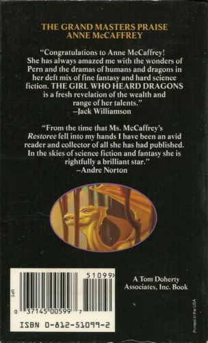 Anne McCaffrey's dragons are the stuff of which SF/fantasy legends are made. All of her dragon books for many years have been national bestsellers. She is one of the most popular writers ever in fantasy and science fiction.The Girl Who Heard Dragons is a feast for McCaffrey fans and for all readers - a big, satisfying compilation of her fiction never before collected in book form. Best of all, it opens with an original short novel of Pern, "The Girl Who Heard Dragons." In addition, the book contains 24 beautiful black and white drawings by award-winning artist Michael Whelan.Romance, humor, colorful description and affecting characters are Anne McCaffrey's hallmarks and the fifteen stories herein have these virtues in abundance. No wonder the Chicago Sun-Times described her as a "master of the well-told tale.""The Girl Who Heard Dragons" is the story of Aramina, a teenage girl of Pern who hears dragons - a skill which does not seem likely to help solve her family's problems. They are "holdless," and must constantly roam the land, trying to hide from bandits. Aramina's mother fears losing her daughter completely to the life of a dragonrider, but McCaffrey has another fate in mind for her young heroine.The fourteen other stories - all just as good - are:Velvet Fields Euterpe on a Fling Duty Calls A Sleeping Humpty Dumpty Beauty The Mandalay CureA Flock of Geese The Greatest Love A Quiet One If Madam Likes You... Zulei, Grace, Nimshi and the DamnyankeeCinderella Switch Habit Is an Old Horse Lady-in-WaitingThe Bones Do Lie