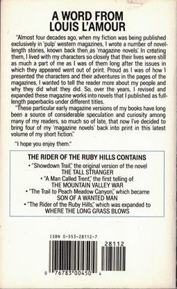 A WORD FROM LOUIS L’AMOUR “Almost four decades ago, when my fiction was being published exclusively in ‘pulp’ western magazines, I wrote a number of novel-length stories, known back then as ‘magazine novels.’ In creating them, I lived with my characters so closely that their lives were still as much a part of me as I was of them long after the issues in which they appeared went out of print. Proud as I was of how I presented the characters and their adventures in the pages of the magazines, I wanted to tell the reader more about my people and why they did what they did. So, over the years, I revised and expanded these magazine works into novels that I published as full-length paperbacks under different titles. “These particular early magazine versions of my books have long been a source of considerable speculation and curiosity among many of my readers, so much so of late, that now I’ve decided to bring four of my ‘magazine novels’ back into print in this latest volume of my short fiction. “I hope you enjoy them.” FEATURING• Showdown Trail• A Man Called Trent• The Trail to Peach Meadow Canyon• The Rider of the Ruby Hills
