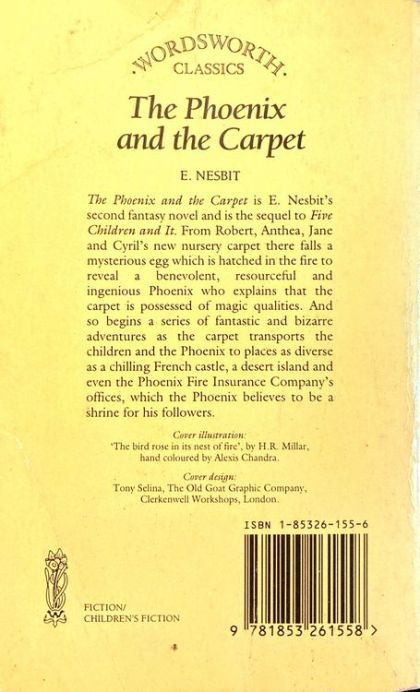 The Phoenix and the Carpet is E. Nesbit's second fantasy novel and is the sequel to Five Children and It. From Robert, Anthea, Jane and Cyril's new nursery carpet there falls a mysterious egg which is hatched in the fire to reveal a benevolent, resourceful and ingenious Phoenix who explains that the carpet is possessed of magic qualities. And so begins a series of fantastic and bizarre adventures as the carpet transports the children and the Phoenix to places as diverse as a chilling French castle, a desert island and even the Phoenix Fire Insurance Company's offices, which the Phoenix believes to be a shrine for his followers.