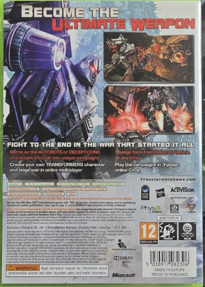 Transformers: War for Cybertron challenges players to become the ultimate weapon as a TRANSFORMERS character in the final, epic war that will determine the survival of their entire race. Armed with a diverse arsenal of lethal, high-tech weaponry and the ability to instantly convert from robot to vehicle at any time, players will engage in heart-pounding battles on land and in the air in this gripping, 3rd person action shooter set in the TRANSFORMERS' war-ravaged homeland. Complete with several multiplayer modes, Transformers: War for Cybertron allows gamers to play through story missions with their friends in drop in/drop out online co-op, and also create their own TRANSFORMERS character for competitive head-to-head multiplayer modes, choosing among four distinct character classes, personalizing its look and selecting from a huge variety of weapons, skills and abilities.