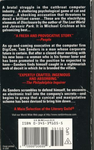 " Expertly crafted, ingenious and absorbing." The Philadelphia Inquirer.The #1 Bestseller by the author of " Jurassic Park." As he did in " Rising Sun, " Crichton focuses on a topic as close as today's newspaper headlines: sexual harassment. Tom Sanders is an up-and-coming executive at the computer firm DigiCom. When his new boss turns out to be a woman who is both his former lover and a business rival, Sanders determines to be professional. But after a closed-door meeting, the woman accuses him of sexual harassment. It's her word against his, and suddenly Sanders finds himself caught in a nightmarish web of deceit in which he is branded as the villian. As he scrambles to save his career and his reputation, Sanders uncovers an electronic trail into DigiCom's secrets . . . and the cynical scheme devised to bring him down.