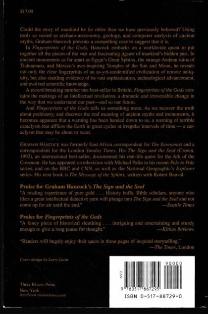 Could the story of mankind be far older than we have previously believed? Using tools as varied as archaeo-astronomy, geology, and computer analysis of ancient myths, Graham Hancock presents a compelling case to suggest that it is. Graham Hancock is featured in Ancient Apocalypse, a Netflix original docuseries.“A fancy piece of historical sleuthing . . . intriguing and entertaining and sturdy enough to give a long pause for thought.”—Kirkus Reviews In Fingerprints of the Gods, Hancock embarks on a worldwide quest to put together all the pieces of the vast and fascinating jigsaw of mankind’s hidden past. In ancient monuments as far apart as Egypt’s Great Sphinx, the strange Andean ruins of Tihuanaco, and Mexico’s awe-inspiring Temples of the Sun and Moon, he reveals not only the clear fingerprints of an as-yet-unidentified civilization of remote antiquity, but also startling evidence of its vast sophistication, technological advancement, and evolved scientific knowledge. A record-breaking number one bestseller in Britain, Fingerprints of the Gods contains the makings of an intellectual revolution, a dramatic and irreversible change in the way that we understand our past—and so our future. And Fingerprints of God tells us something more. As we recover the truth about prehistory, and discover the real meaning of ancient myths and monuments, it becomes apparent that a warning has been handed down to us, a warning of terrible cataclysm that afflicts the Earth in great cycles at irregular intervals of time—a cataclysm that may be about to recur. “Readers will hugely enjoy their quest in these pages of inspired storytelling.”—The Times (UK)