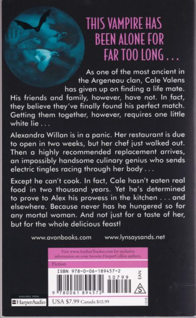 This vampire has been alone for far too long . . . As one of the most ancient in the Argeneau clan, Cale Valens has given up on finding a life mate. His friends and family, however, have not. In fact, they believe they've finally found his perfect match. Getting them together, however, requires one little white lie . . . Alexandra Willan is in a panic. Her restaurant is due to open in two weeks, but her chef just walked out. Then a highly recommended replacement arrives, an impossibly handsome culinary genius who sends electric tingles racing through her body . . . Except he can't cook. In fact, Cale hasn't eaten real food in two thousand years. Yet he's determined to prove to Alex his prowess in the kitchen . . . and elsewhere. Because never has he hungered so for any mortal woman. And not just for a taste of her, but for the whole delicious feast!