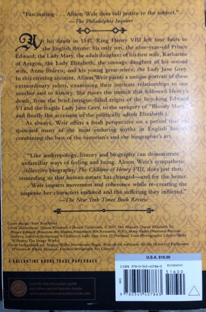 An “engrossing narrative history” (The Boston Globe) of the tempestuous years before the reign of Queen Elizabeth I, from the New York Times bestselling author of The Last White Rose“Fascinating . . . Alison Weir does full justice to the subject.”—The Philadelphia InquirerAt his death in 1547, King Henry VIII left four heirs to the English throne: his only son, the nine-year-old Prince Edward; the Lady Mary, the adult daughter of his first wife Katherine of Aragon; the Lady Elizabeth, the teenage daughter of his second wife Anne Boleyn; and his young great-niece, the Lady Jane Grey. In this riveting account, Alison Weir paints a unique portrait of these extraordinary heirs, examining their intricate relationships to each other and to history. She traces the tumult that followed Henry's death, from the brief intrigue-filled reigns of the boy king Edward VI and the fragile Lady Jane Grey, to the savagery of “Bloody Mary,” and finally the accession of the politically adroit Elizabeth I.As always, Weir offers a fresh perspective on a period that has spawned many of the most enduring myths in English history, combining the best of the historian’s and the biographer’s art.“Alison Weir’s sympathetic collective biography [reminds] us that human nature has changed—and for the better. . . . Weir imparts movement and coherence while re-creating the suspense her characters endured and the suffering they inflicted.”—The New York Times Book Review