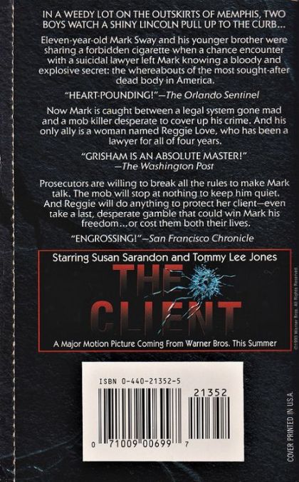 Mark Sway, 11, witnesses a Mafia lawyer's suicide, which puts him in danger from Barry the Blade & a politically ambitious U.S. attorney. In the two years since The Firm first captured the imagination of America's readers, John Grisham, with three consecutive number-one bestsellers, has become one of the most popular authors of our time. Now, in The Client, he has written a novel so irresistible, so thoroughly entertaining and satisfying, that it is sure not only to please his millions of fans, but to win him new ones as well. This is the story of eleven-year-old Mark Sway, who, as the novel opens, witnesses the bizarre suicide of a New Orleans attorney. Just before he dies, the lawyer tells Mark a deadly secret concerning the recent murder of a Louisiana Senator, whose accused killer, Mafia thug Barry Muldanno, is about to go to trial. The police, the federal prosecutor and the FBI pressure Mark to tell them the attorney's last words, but he knows that with the mob watching his every move, revealing his secret will almost surely get him killed. So Mark, streetwise and old beyond his years, hires a lawyer: Reggie Love, a fifty-two-year-old divorcee who's been through more than anyone could imagine and survived, basically, because she's tough. And feisty. And loves helping kids overlooked or abused by the system. But when Mark's life is threatened, and Reggie discovers her office has been bugged, and even the Juvenile Court judge says Mark has no choice but to talk, she realizes that this time she's in way over her head. But then Mark comes up with a plan ... a crazy plan, in Reggie's opinion, but it's their only hope. And it just might work. With the page-turning suspense and terrific plot twists that have become John Grisham's trademark, he has once again crafted a novel that simply cannot be put down. But in The Client Grisham has gone a step further - with a cast of unforgettable characters headed by the most original hero in years, he has mixed equal parts humor and warmth to truly expand the boundaries of the legal thriller.