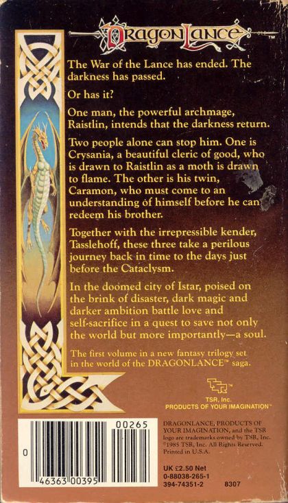 New York Times–bestselling series: The War of the Lance has ended, and the darkness has passed. Or has it? Sequestered in the blackness of the dreaded Tower of High Sorcery in Palanthas, and surrounded by nameless creatures of evil, archmage Raistlin Majere weaves a plan to conquer the darkness—to bring it under his control.Two people alone can stop him. One is Crysania, a beautiful and devoted cleric of Paladine, who tries to use her faith to lead Raistlin from the darkness. She is blind to his shadowed designs, and he draws her slowly into his neatly woven trap.The other is Raistlin’s twin, Caramon. Made aware of his brother’s plan, a distraught Caramon travels back in time to the doomed city of Istar in the days before the Cataclysm. There, together with the ever-present kender Tasslehoff, Caramon will make his stand to save Raistlin’s soul.Or so he believes.