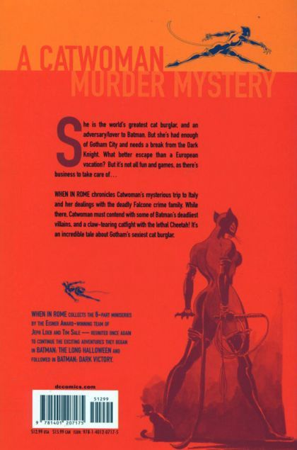 The Eisner Award-winning team of Jeph Loeb and Tim Sale returns to further the exciting adventures they began in BATMAN: THE LONG HALLOWEEN and followed in BATMAN: DARK VICTORY! Collecting the 6-part series that guest-starred Batman and a host of Gotham's most colorful and dangerous villains, WHEN IN ROME chronicles Catwoman's mysterious trip to Italy and her dealings with the deadly Falcone crime family. It's an incredible tale of Gotham's sexiest cat burglar!