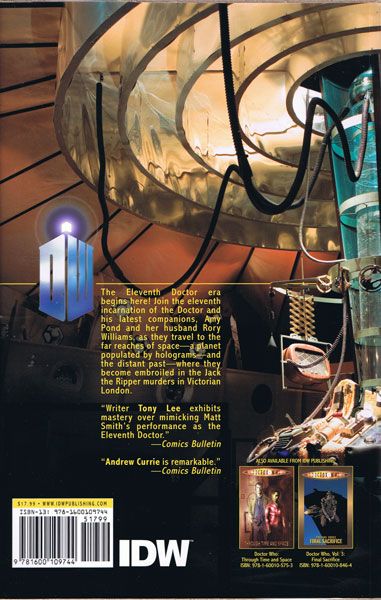 Tony Lee (w) o Andrew Currie, Richard Piers Rayner, Tim Hamilton (a) o Tommy Lee Edwards (c) The Eleventh Doctor era begins here! Join the eleventh incarnation of the Doctor and his latest companions, Amy Pond and her husband Rory Williams, as they travel to the far reaches of space-a planet populated by holograms-and the distant past-where they become embroiled in the Jack the Ripper murders in Victorian London!? The book collects the first four issues of the ongoing series, written by Tony Lee (Doctor Who: The Forgotten), with art by Andrew Currie (The Ultimates), Richard Piers Rayner (Road to Perdition), and Tim Hamilton (Fahrenheit 451).