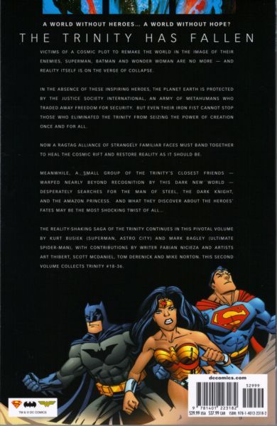Written by Kurt Busiek and Fabian Nicieza Art by Mark Bagley, Scott McDaniel, Mike Norton, Tom Derenick, Art Thibert, Andy Owens, Jerry Ordway and Wayne Faucher Cover by Mark Bagley and Art Thibert The second TRINITY collection, featuring issues #18-35 of the weekly series, is here! 'The Trinity of Heroes' are legendary characters who are believed to be the keystone to all of creation. Convinced that Batman, Superman and Wonder Woman are this Trinity, sorceress Morgaine LeFey teams up with Despero and Enigma to replace the three icons with evil doppelgangers from the Multiverse in order to recreate existence. Can the greatest heroes of 52 universes stop this evil plot - or will evil win? Advance-solicited; on sale August 26 o 424 pg, FC, $29.99 US