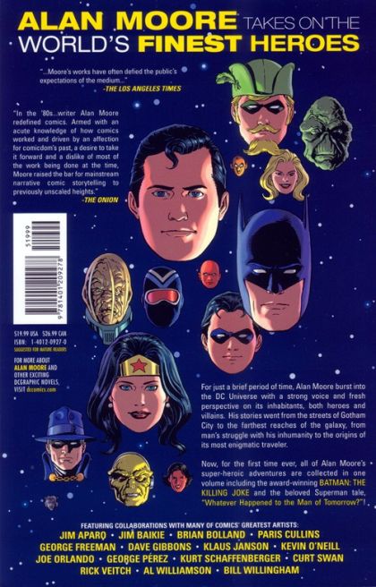 Written by Alan Moore Art by Jim Aparo, Jim Baikie, Brian Bolland, Paris Cullins, George Freeman, Dave Gibbons, Klaus Janson, Kevin O'Neill, Joe Orlando, George P?rez, Kurt Schaffenberger, Curt Swan, Rick Veitch, Al Williamson and Bill Willingham Cover by Brian Bolland Don't miss this exhaustive collection featuring the World's Greatest Super-Heroes as interpreted by one of the most acclaimed authors in comics! The work of Alan Moore (WATCHMEN, V FOR VENDETTA, THE LEAGUE OF EXTRAORDINARY GENTLEMEN) in the DCU during the 1980s is considered a benchmark for great stories with fresh approaches to iconic characters. Collected in this volume are all of Moore's Superman and Batman stories, including the long out-of-print 'Whatever Happened to the Man of Tomorrow?' as well as, for the first time in trade paperback, BATMAN: THE KILLING JOKE (illustrated by Brian Bolland, who provides a new cover). This volume - which no comics fan should be without - collects stories from ACTION COMICS #584, BATMAN ANNUAL #11, BATMAN: THE KILLING JOKE, DC COMICS PRESENTS #85, DETECTIVE COMICS #549-550, GREEN LANTERN #188, THE OMEGA MEN #26-27, SECRET ORIGINS #10, SUPERMAN #423, TALES OF THE GREEN LANTERN CORPS ANNUAL #2 & 3, SUPERMAN ANNUAL #11 and VIGILANTE #17-18. On sale January 2