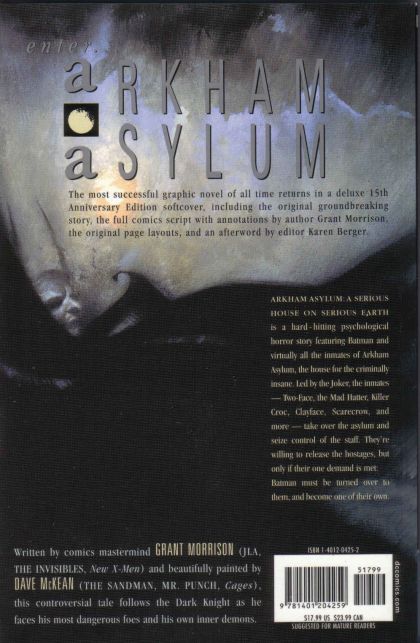 Written by Grant Morrison Art and cover by Dave McKean In celebration of the 16th anniversary of the critically acclaimed Batman story that helped launch the U.S. careers of Grant Morrison and Dave McKean, DC Comics is proud to present a softcover edition of the ARKHAM ASYLUM ANNIVERSARY EDITION, reprinting the now-classic confrontation between the Dark Knight and his archnemeses the Joker, Two-Face, Scarecrow, Poison Ivy, and more in the black heart of Gotham City's house for the criminally insane. This graphic novel is well known for its psychological intensity and probing portraits of Batman and the Joker, as well as groundbreaking art that influenced scores of artists by introducing a new school of storytelling and technique to comics. This special edition also includes Morrison's complete original script annotated by both himself and editor Karen Berger, many of his original thumbnail breakdowns, step-by-step samples of how the story and art came together and much more!