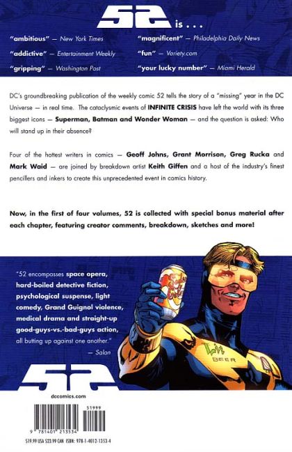 After the INFINITE CRISIS, the DC Universe spent a year without Superman, Batman and Wonder Woman-a year in which those heroes were needed more than ever as the fate of the world hung in the balance. 52 features the best and brightest writers from the comic-book field including Geoff Johns (INFINITE CRISIS), Grant Morrison (ALL STAR SUPERMAN), Greg Rucka (WONDER WOMAN) and Mark Waid (KINGDOM COME), working together to tell the tale of a world awakening from a nightmare to face a new day.
