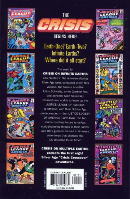 Written by Gardner Fox; art by Mike Sekowsky, Bernard Sachs and Sid Greene; painted cover by Alex Ross In stores July 10. The CRISIS begins here! The much-demanded early 'Crisis Crossover' stories are finally collected, featuring the Justice League of America (Earth-One) meeting their Golden Age predecessors, the Justice Society of America (Earth-Two)! This volume collects the first four 2-part 'Crisis Crossover' adventures, reprinting JUSTICE LEAGUE OF AMERICA #21-22, 29-30, 37-38, and 46-47. Our heroes battle the Injustice Society, the Crime Syndicate of Earth-Three, the evil Johnny Thunder, and the Anti-Matter Man! For more information, see the feature article. SC, 7x10, 208pg, FC