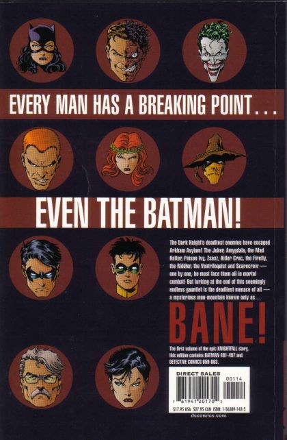 In the first installment of this classic storyline, the Dark Knight's greatest enemies have all simultaneously escaped from Arkham Asylum and are preying on Gotham City. With his city under siege, Batman pushes his body to the limit as he takes on The Joker, the Mad Hatter, Poison Ivy, Killer Croc, The Riddler and the Scarecrow. But things get much worse when Bane, the man behind all the madness, confronts an exhausted Batman - and breaks his back. This massive first KNIGHTFALL volume collects BATMAN: VENGEANCE OF BANE SPECIAL #1, BATMAN #491-500, DETECTIVE COMICS #659-660, SHOWCASE '93 #7 and 8 and BATMAN: SHADOW OF THE BAT #17-18, including chapters never previously reprinted.