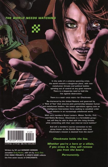 Written by Greg Rucka Art and cover by Jesus Saiz Collecting the first seven issues of the acclaimed new series from Greg Rucka! After the explosive events of INFINITE CRISIS and THE OMAC PROJECT, the U.N. formed Checkmate to bring down heroes and villains that get out of line. Now they use unique ability to deputize human and metahuman forces throughout the world in pursuit of its goal to hold the line. Advance-solicited; on sale February 21 ? 168 pg, FC, $14.99 US