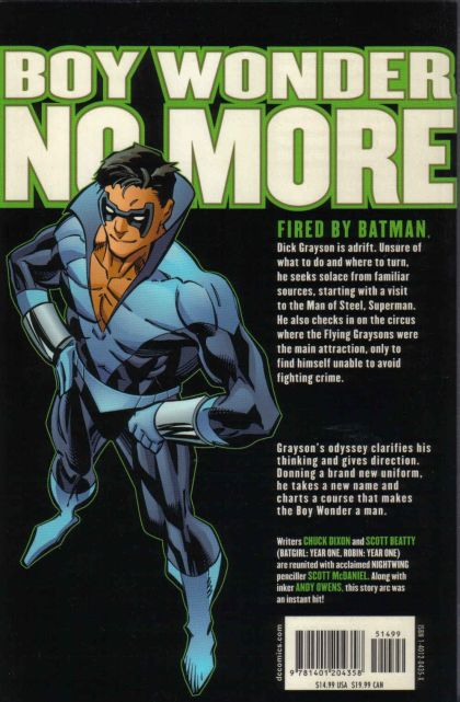 Written by Chuck Dixon & Scott Beatty Art and cover by Scott McDaniel & Andy Owens Collecting the sold-out 6-part origin story presented in NIGHTWING #101-106! Learn the legendary history of Dick Grayson and his life after Batman fired him, as he gains advice from Superman, aids Deadman, and makes the decisions that lead him to become a new crimefighter!