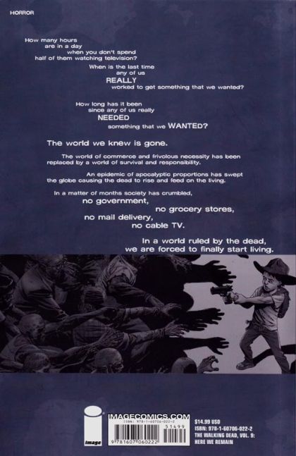 In the last volume we learned that no one is safe. Now after the staggering losses they've sustained, Rick and Carl are left to pick up the pieces and carry on... knowing that they could join thier fallen friends and family at any moment. Collects issues 49-54. RETAILER WARNING: MAY NOT BE SUITABLE FOR ALL AGES.