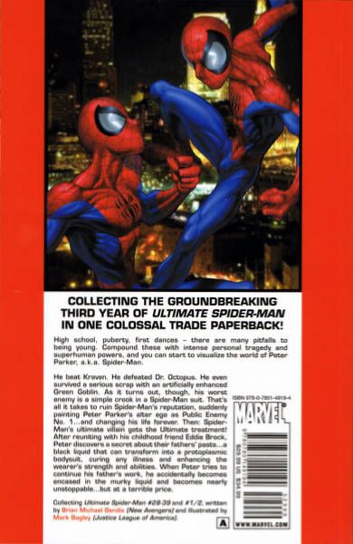 Written by BRIAN MICHAEL BENDIS Penciled by MARK BAGLEY Cover by MARK BAGLEY Collecting the groundbreaking third year of ULTIMATE SPIDER-MAN in one colossal trade paperback! Spider-Man beat Kraven. He defeated Dr. Octopus. He even survived a serious scrap with an artificially enhanced Green Goblin. As it turns out, though, his worst enemy is a simple crook in a Spider-Man suit. That's all it takes to ruin Spider-Man's reputation, suddenly painting Peter Parker's alter ego as Public Enemy No. 1...and changing his life forever. Then: Spider-Man's ultimate villain gets the Ultimate treatment! After reuniting with his childhood friend Eddie Brock, Peter discovers a secret about their fathers' pasts?a black liquid that can transform into a protoplasmic bodysuit, curing any illness and enhancing the wearer's strength and abilities. But when Peter tries to continue his father's work, he accidentally becomes encased in the murky liquid and becomes nearly unstoppable?but at a terrible price. Collecting ULTIMATE SPIDER-MAN #1/2 & #28-39.