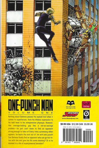Nothing about Saitama passes the eyeball test when it comes to superheroes, from his lifeless expression to his bald head to his unimpressive physique. However, this average-looking guy has a not-so-average problem -- he just can't seem to find an opponent strong enough to take on! Every time a promising villain appears, he beats the snot out of 'em with one punch! Can Saitama finally find an opponent who can go toe-to-toe with him and give his life some meaning? Or is he doomed to a life of superpowered boredom? For teen audiences.