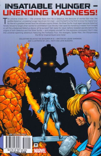 His name strikes terror throughout the universe: Galactus, the devourer of worlds! But now, the godlike Galactus' unceasing hunger has driven him mad - and he has come to destroy the Earth! As Marvel's greatest heroes face the ultimate cosmic threat, the Silver Surfer must again become Galactus' herald - and target other worlds for annihilation! Can the sky-rider save his monstrous master from himself, or will the unbalanced Galactus devour all he surveys? Get ready for never-before-revealed shocking secrets behind the origins of both Galactus and the Silver Surfer - and prepare yourself for the most unexpected death of all! Don't miss this universe-spanning adventure, illustrated by legendary Silver Surfer artists John Buscema and Jon J Muth! Featuring the Fantastic Four, the Avengers, Spider-Man, the Starjammers, the Shi'ar Imperial Guard and more! Collecting GALACTUS THE DEVOURER #1-6.