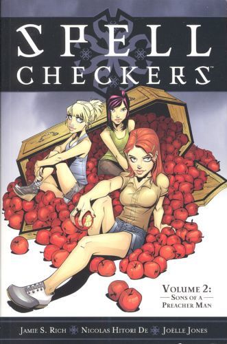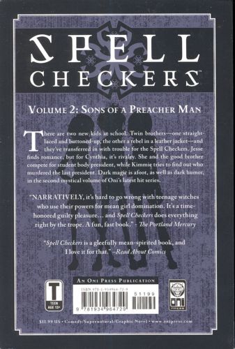 (W) Jamie S. Rich (A) Nicolas Hitori De, Jo?lle Jones (C) Jo?lle Jones Advance Solicit for September, There are two new kids at school. Twin brothers--one straight-laced and buttoned-up, the other a rebel in a leather jacket--and they've transferred in with trouble for the Spell Checkers. Jesse finds romance, but for Cynthia, it's rivalry. She and the good brother compete for student body president, while Kimmie tries to find out who murdered the last one. Dark magic is afoot, as well as dark humor, in the second mystical volume of Oni's latest hit series.