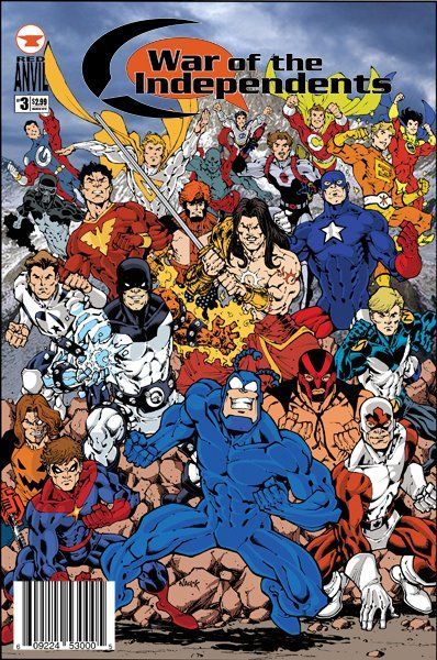 The War of the Independents roves the multiverse, and in this issue the supermen are on their way to Norway to locate the fabled hammer, belt and gloves of Thor, the legendary Norse god of thunder. Meanwhile the villain, Maldestrak, a being of godlike power who is pure evil and bent on the utter destruction of all forms of life, arrives there first acquires the magical items as well as their incredible power; then proceeds to kick everyone's butts. Guest stars this issue include the Tick, Atomica, Karma, and El Gato Negro, as well as many others.