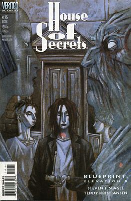 Painted cover art by Teddy Kristiansen. Elevation B, script by Steven T. Seagle, art by Teddy Kristiansen; Rain and Ben finally come to terms with their relationship; An aspiring architect comes under the influence of the House of Secrets while workmen attempt to destroy the House of Secrets with bad results; It is also revealed that Mr. Dalrymple purchased the original blueprints for the House of Secrets and built hundreds of them across the country. Steven Seagle talks about the deadline problems that have plauged this series and the other work that includes working on the screenplay for a House of Secrets movie which has caused the series to be ended. The series will continue as a series of mini-series as each storyline is finished. The first mini-series is House of Secrets: Façade. 36 pgs. $2.50. Cover price $2.50.