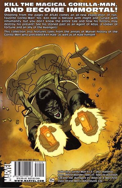 Written by JEFF PARKER with JASON AARON Penciled by GIANCARLO CARACUZZO with ROGER CRUZ Cover by DAVE JOHNSON Shooting from the pages of ATLAS, comes an all-new exploration of fan-favorite GORILLA MAN! Yes, Ken Hale is blessed with might and cursed with inhumanity, but you don't know the entire tale, and how his history may destroy his present! See his storied past as an Agent of Atlas, a soldier of fortune, an ally of the Avengers, and a Howling Commando! Plus, learn the history of Marvel's Gorilla Men in 'Tales of the Gorilla Man' and then watch as Ken Hale takes the X-Men on a journey through the jungle in X-MEN: FIRST CLASS #8. Collecting GORILLA MAN #1-3 and material from AVENGERS VS. ATLAS #4. 144 PGS./Rated T+