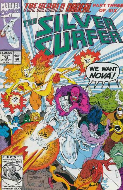 "The Herald Wars" continues! The Silver Surfer and Firelord finally find Nova on a "wild west"-style planet, but she's had a nervous breakdown and doesn't remember eithe rof them. Moreover, a bunch of jealous gunslingers don't like the Surfer and Firelord messing with their favorite saloon gal!
